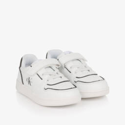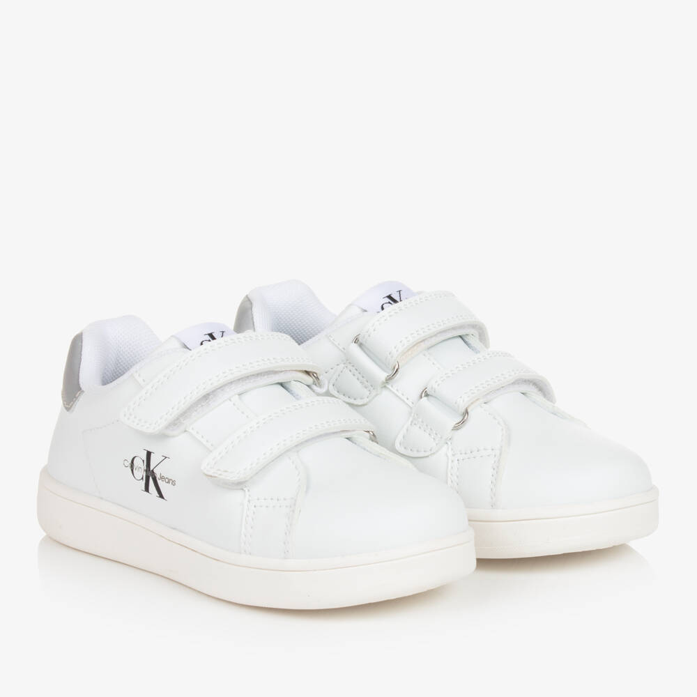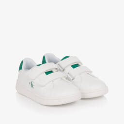 White faux leather trainers for boys and girls by Calvin Klein, with a contrast grey panel on the heel. Comfortable to wear, they have a breathable textile lining and lightly padded insoles with non-slip rubber outer soles providing good grip underfoot. They fasten with easy-to-use velcro straps across the foot. A distinctive Calvin Klein monogram can be seen on the sides with further branding on the tongue adding an extra designer detail. This item is made with at least 50% recycled materials.