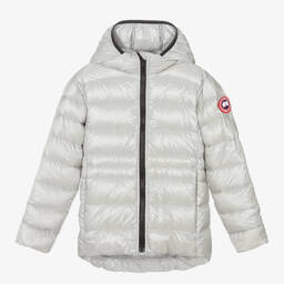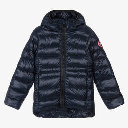 Navy blue Mini-me puffer jacket for girls by luxury brand Canada Goose, with the iconic logo badge on one sleeve. It features reflective trims on the hood, a white logo on the inside of the black zip placket and an elasticated panel on the back for a good fit. There are recessed Power Stretch cuffs on the sleeves to lock in warmth and concealed, hand-warming pockets on the front. Luxuriously down padded, it is made from ultra-lightweight, recycled nylon ripstop with a durable, wind-resistant, water-repellent finish. Designed for light rain, snow and wind, this versatile jacket folds away into the interior pocket to be carried hands-free as a backpack.