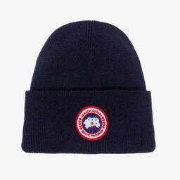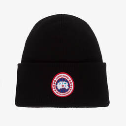Bright red beanie hat for boys and girls by luxury brand Canada Goose, knitted in soft Merino wool. Super cosy, it is lined in soft polar fleece for extra warmth. The brand's distinctive red, white and blue logo patch is featured on the front of the turned up brim for a bold designer statement.