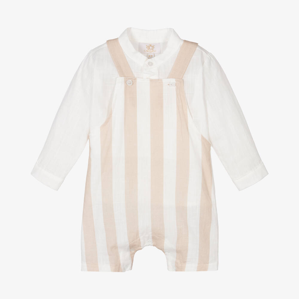 A gorgeous white and beige dungaree set for baby boys, by Caramelo Kids. Made in soft cotton voile, the lightweight shirt is collarless, fastening with buttons for a charmingly neat look. To complete the outfit, the striped dungarees have button closures on the shoulder straps. There are easy-to-fasten poppers between the legs for effortless dressing.