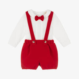 Traditionally styled ivory and red tartan shorts set for baby boys by Caramelo Kids, charming for a special occasion. With a slight stretch, the ivory cotton poplin shirt has pintucks, a bow tie, and a button fastening on the back. The shorts have shoulder straps that fasten with buttons to the front of the gently elasticated waist to keep them in place.