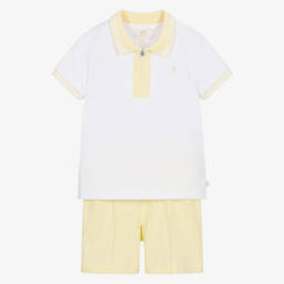 This traditionally styled red and white shorts set for baby boys by Caramelo Kids combines classic charm with comfort. Ideal for a special occasion, the bodysuit has an attached bow tie and pintuck detailing, with popper fastenings on the back and between the legs for easy dressing. The cotton sateen shorts have cute turn-ups, front pockets and adjustable shoulder straps. The gently elasticated waistband fastens on the front with a button and zip.
