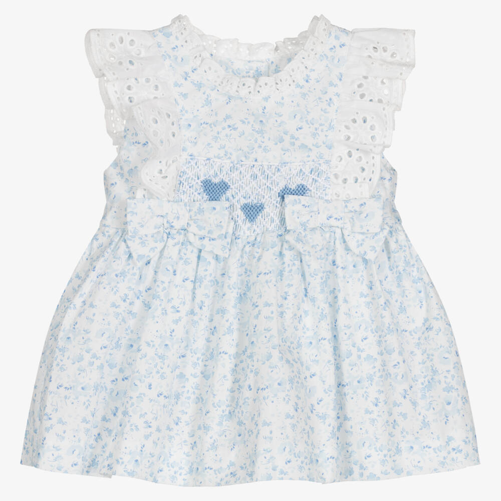 Patterned in a charming blue floral print, this white cotton dress for baby girls is by British brand Caramelo Kids. It has classic smocking detail, beautiful ivory broderie anglaise ruffles, and pretty bow trims. It fastens with buttons on the back. A pair of matching knickers completes this classic look.