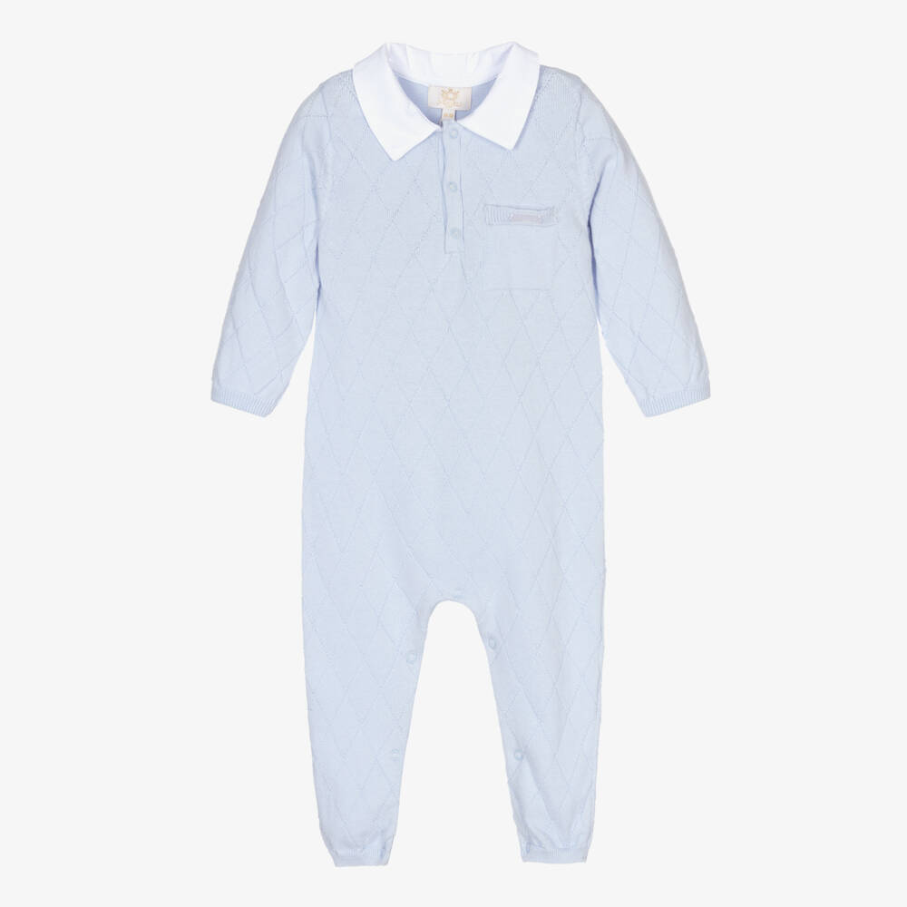 Pale blue romper for baby boys by Caramelo Kids. It is knitted in a soft cotton and acrylic blend, in a smart diamond-shaped pattern. There is a white pointed cotton collar, with poppers on the chest and between the legs. A pearly white logo tab is sewn on the chest pocket.