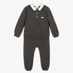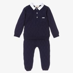 Little boys navy blue two-piece trousers set from Caramelo Kids. It is knitted in a soft cotton and acrylic blend, with a diamond pattern and a white cotton collar. The top fastens with buttons on the front and has a chest pocket. The trousers have an elasticated waistband and ribbed cuffs.
