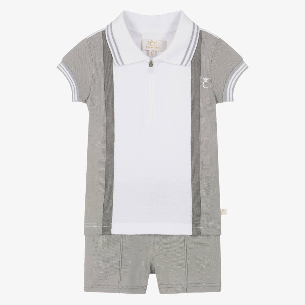 Boys grey shorts set by Caramelo Kids, made in soft cotton piqué. In a smart grey and white colourblock design, the polo shirt has striped ribbed trims and an easy zip fastening. Completing the casual look, the shorts are styled with slanted pockets and a stretchy, drawstring waistband for a comfortable fit.
