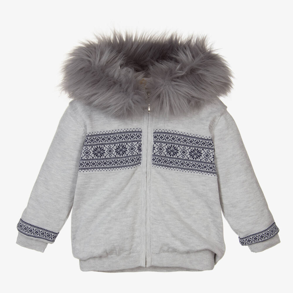 Cosy grey zip-up top for little boys by Caramelo Kids, knitted in a comfortable cotton blend. Lined in soft teddy fleece for warmth, this lovely top has a sweet navy blue Fair Isle pattern across the chest and on the cuffs. It has ribbed trims and fastens at the front with an easy-to-use zip. The large hood has a detachable faux fur trim that secures with buttons for an alternative look.