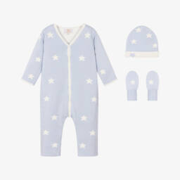 Ivory babysuit set for baby boys by Caramelo Kids, knitted in a double layer of soft, mid-weight cotton. The cosy pramsuit has a beige star pattern and beige trims. It fastens with poppers on the front for easy dressing. It comes with a matching hat and pair of mittens for extra warmth.