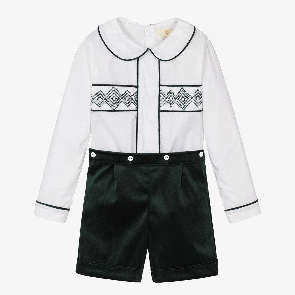 Smart, white and dark green shorts set for boys from Caramelo Kids. The white long-sleeved shirt is beautifully smocked with green embroidery detail, velour piping trims and a rounded collar. It fastens with buttons on the back. The super soft velvet shorts have a part elasticated waistband and gentle pleats. This traditionally styled outfit fastens together with buttons, keeping both pieces neatly in place.