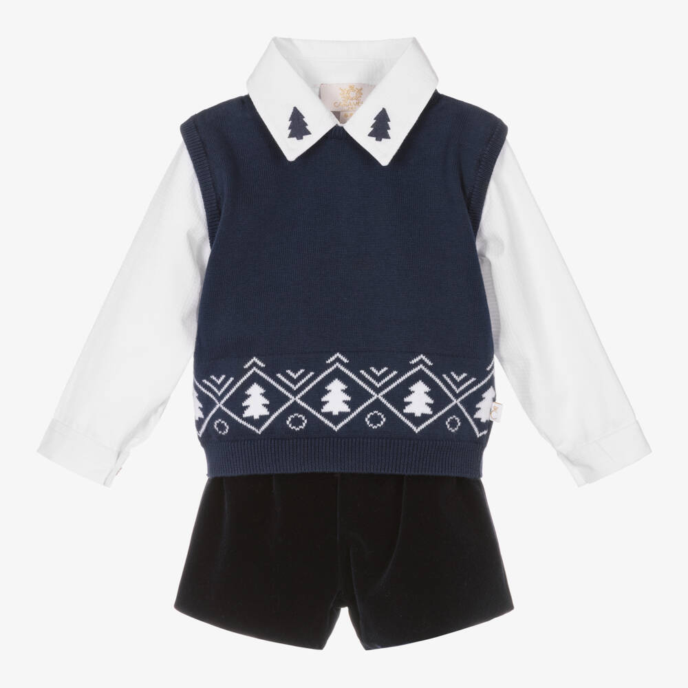 Exclusive to Childrensalon, formal occasion white and blue three-piece shorts set for boys from Caramelo Kids. The navy blue sweater vest is knitted in soft cotton for warmth and comfort, with a white Christmas tree pattern on the front. The white button-up cotton blend shirt has sweet blue Christmas trees embroidered on the collar for a coordinating look. The tailored, navy blue velvet shorts fasten with a single button and have an adjustable waist for a better fit.