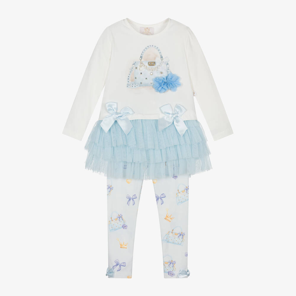 Pretty blue leggings set for girls by Caramelo Kids, made in soft cotton jersey. The long-sleeved top has a fabulous blue handbag print, with satin ribbons, diamanté embellishments and a tulle flower appliqué. Trimmed with a blue tutu-style hem, the top pairs effortlessly with the cute, coordinating leggings.