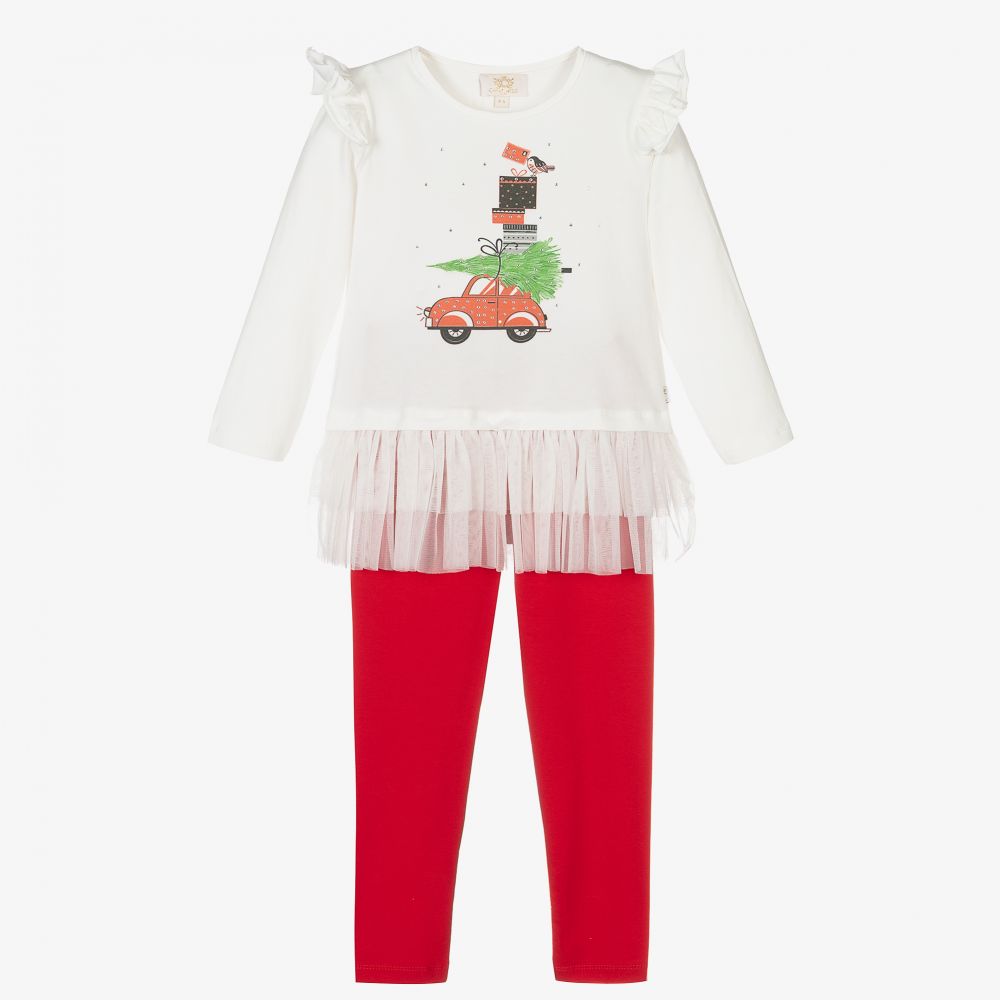 Girls ivory and red festive leggings set from Caramelo Kids. The top is made in soft cotton jersey, with ruffles over the shoulders and soft tulle ruffles on the hem. It has a Christmas-themed print on the chest and a scattering of diamantés over the front. The long red leggings have a comfortable elasticated waistband.