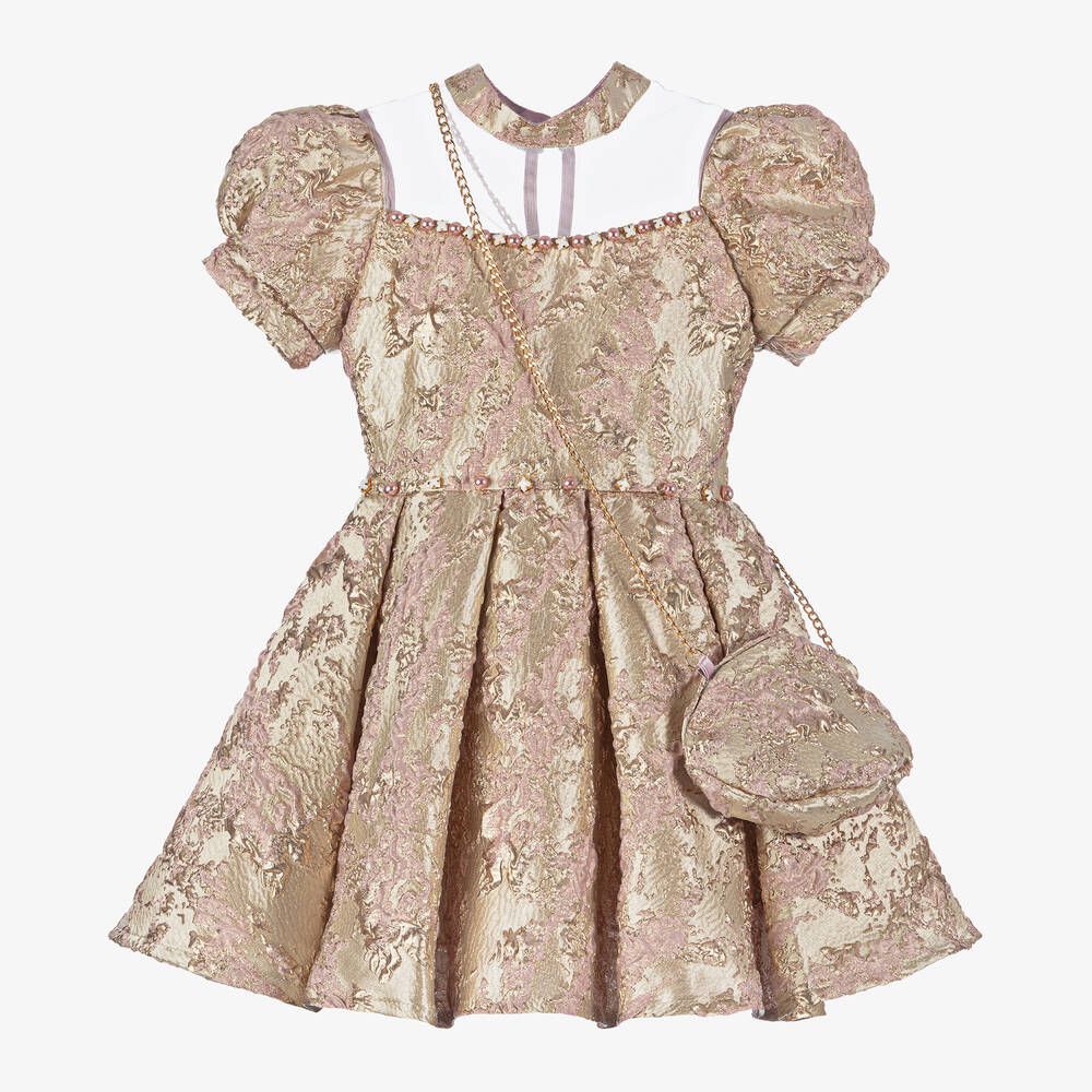 Gorgeous gold and pink dress for girls by Caramelo Kids, made from lustrous metallic jacquard fabric. Romantic and enchanting, it has puffed short sleeves and a sheer tulle panel with faux pink pearl and white jewel detailing for added glamour. The flared box-pleated skirt has a tulle underlayer and lightweight lining, creating a charming silhouette. Fastening with a concealed zip and keyhole button on the back, there is a sash tie with a statement bow decoration for an elegant finish. A coordinating handbag with a gold chain strap completes the look.