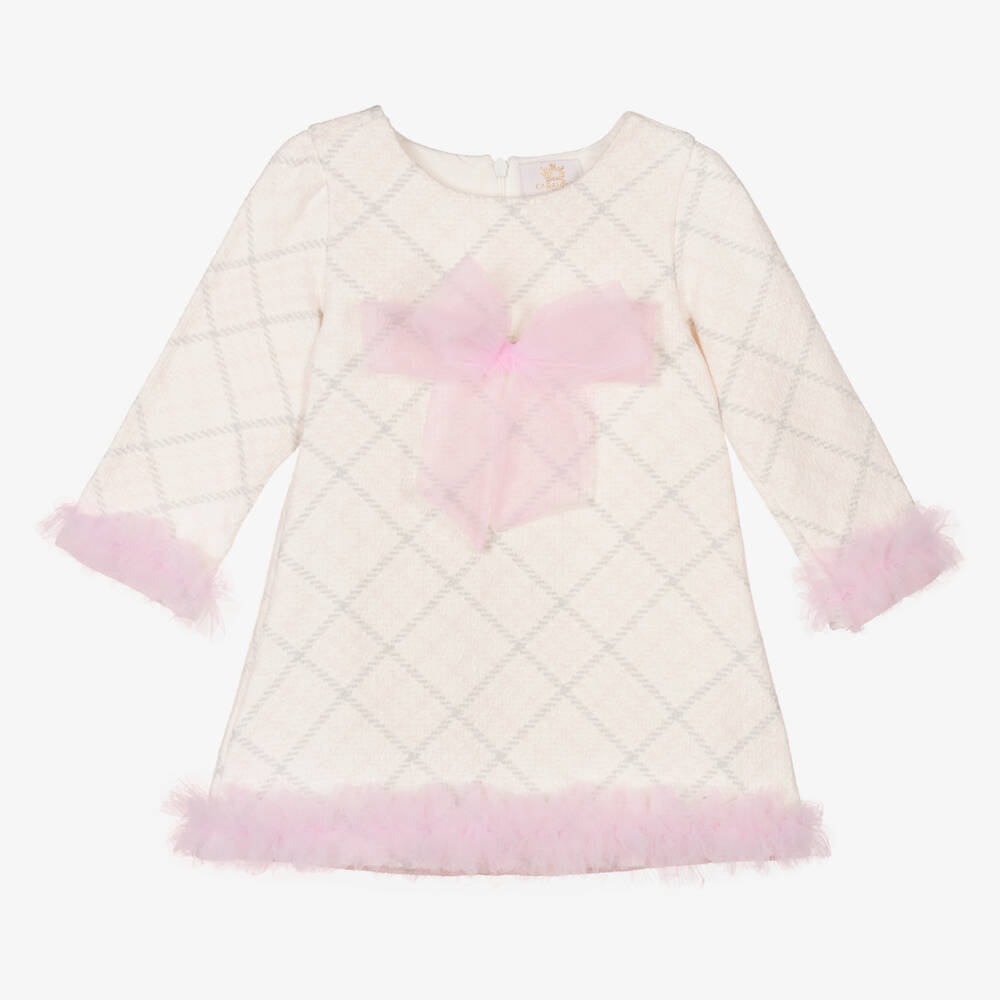 Pretty ivory dress for girls by British brand Caramelo Kids, made in soft cotton tweed. This classically styled dress has a subtle pink and grey check pattern and a concealed zip fastening on the back. It has pretty pink tulle ruffle trims on the cuffs and hem and a large pink tulle bow on the front. It is lined in lightweight cotton for comfort.