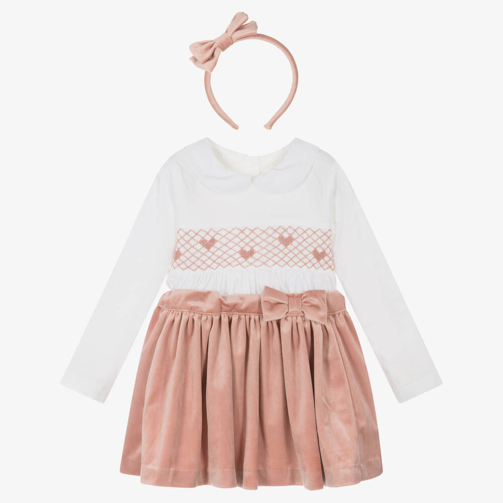 A charming pale pink and ivory skirt set for girls by Caramelo Kids. Made from lightweight cotton, the long-sleeved blouse has a beautiful smocked panel with pink embroidered heart detailing across the chest. Partially lined, it has a sweet Peter Pan collar, a gathered peplum, and back button fastenings for a classic finish. The soft velvet skirt has a comfortable adjustable waist and a bow embellishment that matches the co-ordinating hairband.