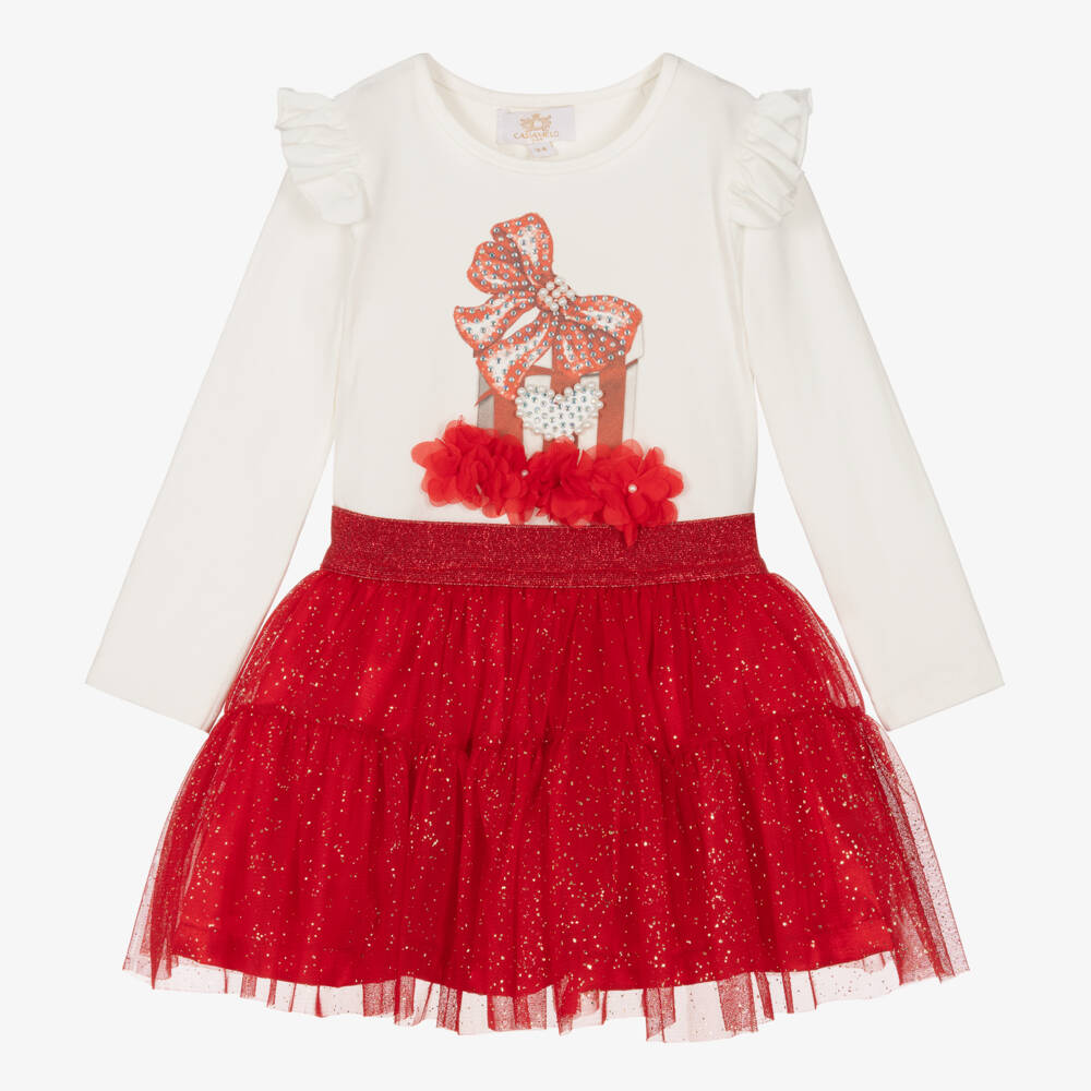 A lovely ivory and red skirt set for girls by Caramelo Kids. Embellished with diamantés and faux pearls, the long-sleeved top has a pretty present design with a large bow and pretty tulle flowers. Made from soft cotton jersey, it has sweet frills on the shoulders for an added girly touch. Decorated with gold sparkles, the tulle skirt has smooth satin and lightweight voile underlayers for a voluminous shape. The glittery waistband is elasticated for a comfortable fit.