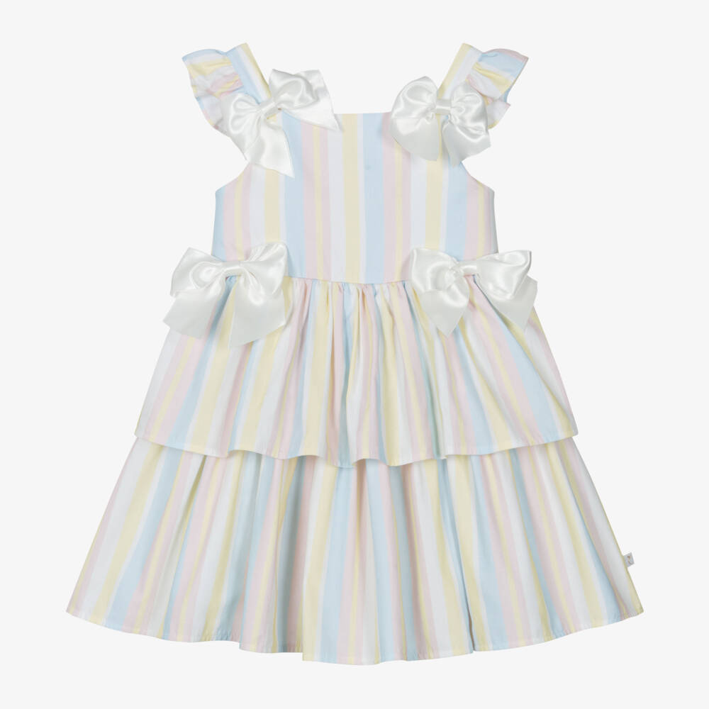 Pretty striped dress for girls by Caramelo Kids, made in soft, lightweight cotton. In lovely pastel shades of pink, yellow and blue, it has ruffle short sleeves, white satin bow trims on the front and a shirred back for a good fit. It is fully lined and the tiered skirt has a tulle layer for added volume.