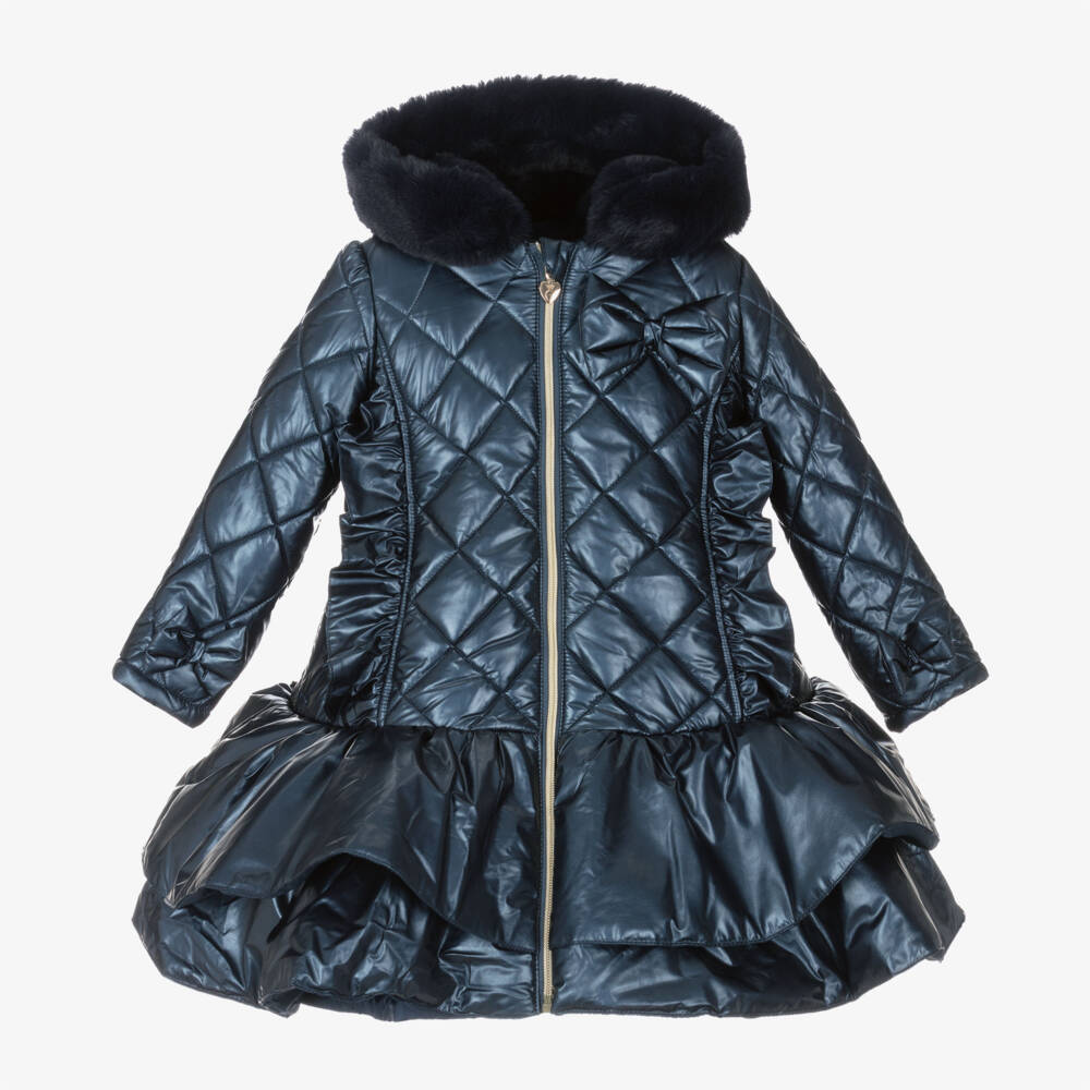 Designed with a metallic sheen, this gorgeous navy blue coat for girls by Caramelo Kids, has a fixed hood with a cosy faux fur lining and trim. Made in a smooth, quilted fabric, it is styled with a layered, frilled hemline and a partially elasticated waistband for shape. It is trimmed with ruffles and decorative bows and features internal ribbed cuffs and useful pockets, which secure with gold-tone branded poppers. A gold zip fastening on the front completes the stylish look.