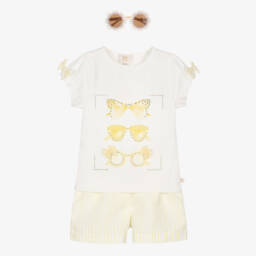 Girls comfortable shorts set by Caramelo Kids, in a white and yellow colourway. The jersey T-shirt has a fun and sparkly graphic of yellow sunglasses with diamantés and pretty bows on the sleeves. The lightweight shorts have a yellow and white stripe pattern and a gently elasticated waistband for a comfortable fit. A pair of sunglasses with tinted lenses and diamanté trims completes the look.