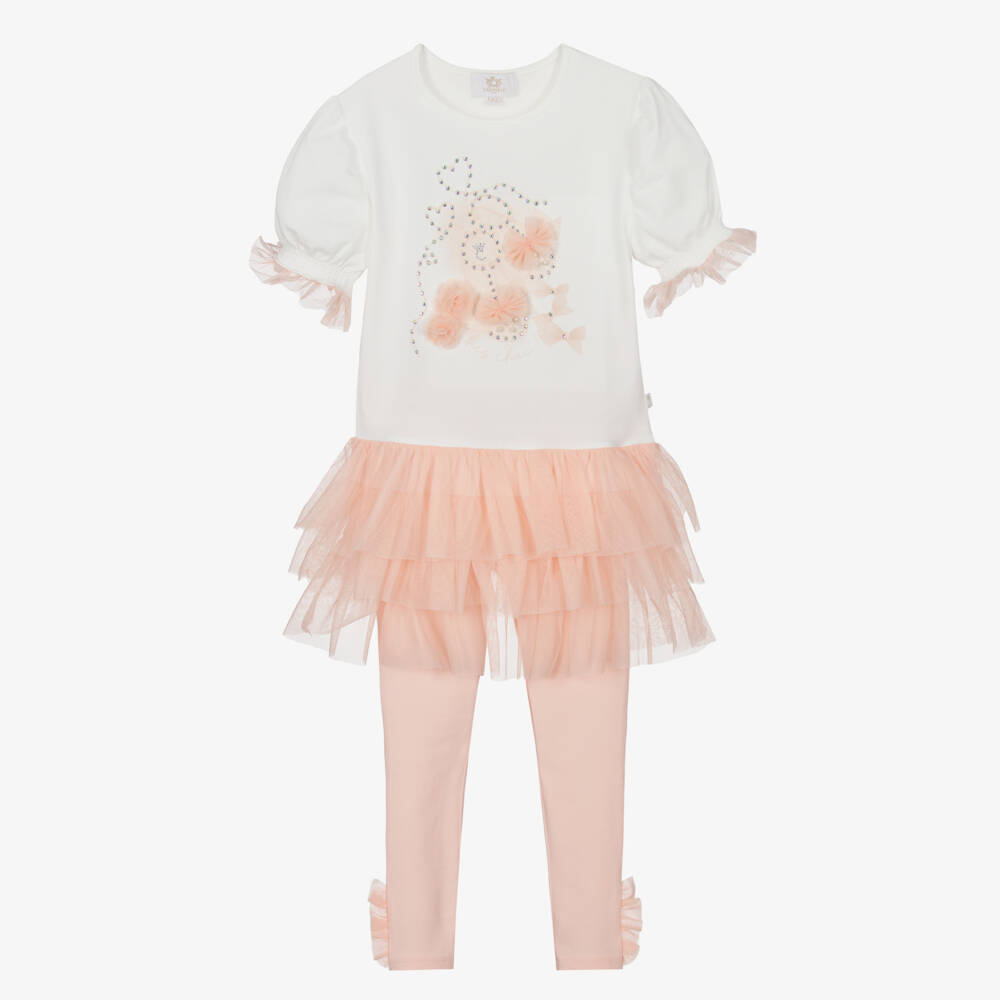 Pretty white and peach pink leggings set for girls by Caramelo Kids. Made in soft jersey with a tiered tulle hem, the top has a charming shoe illustration on the front, beautifully embellished with sparkly diamantés and faux pearl beads. The matching full-length leggings have a gently elasticated waistband for a comfortable fit.