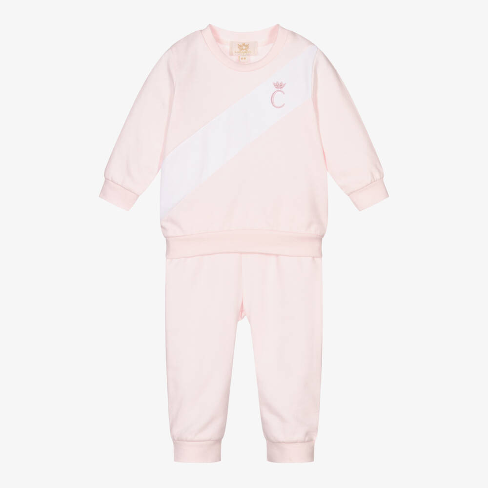 Pink tracksuit for girls by Caramelo Kids, made in soft cotton jersey with a brushed feel inside. The top has a white diagonal panel with a pink embroidered logo, and an embroidered logo tab on the side seam. The joggers have a gently elasticated waistband and ankle cuffs.