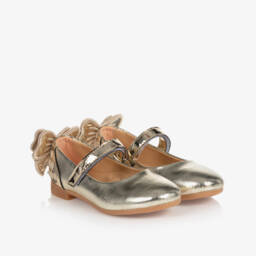 Smart pink shoes for girls by Caramelo Kids, made in soft faux leather, embroidered with pretty bows. They have a smooth lining, a lightly padded insole and a non-slip rubber outer sole with a small heel. They fasten with a velcro strap around the ankle, trimmed with a bow for a sweet finish.