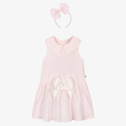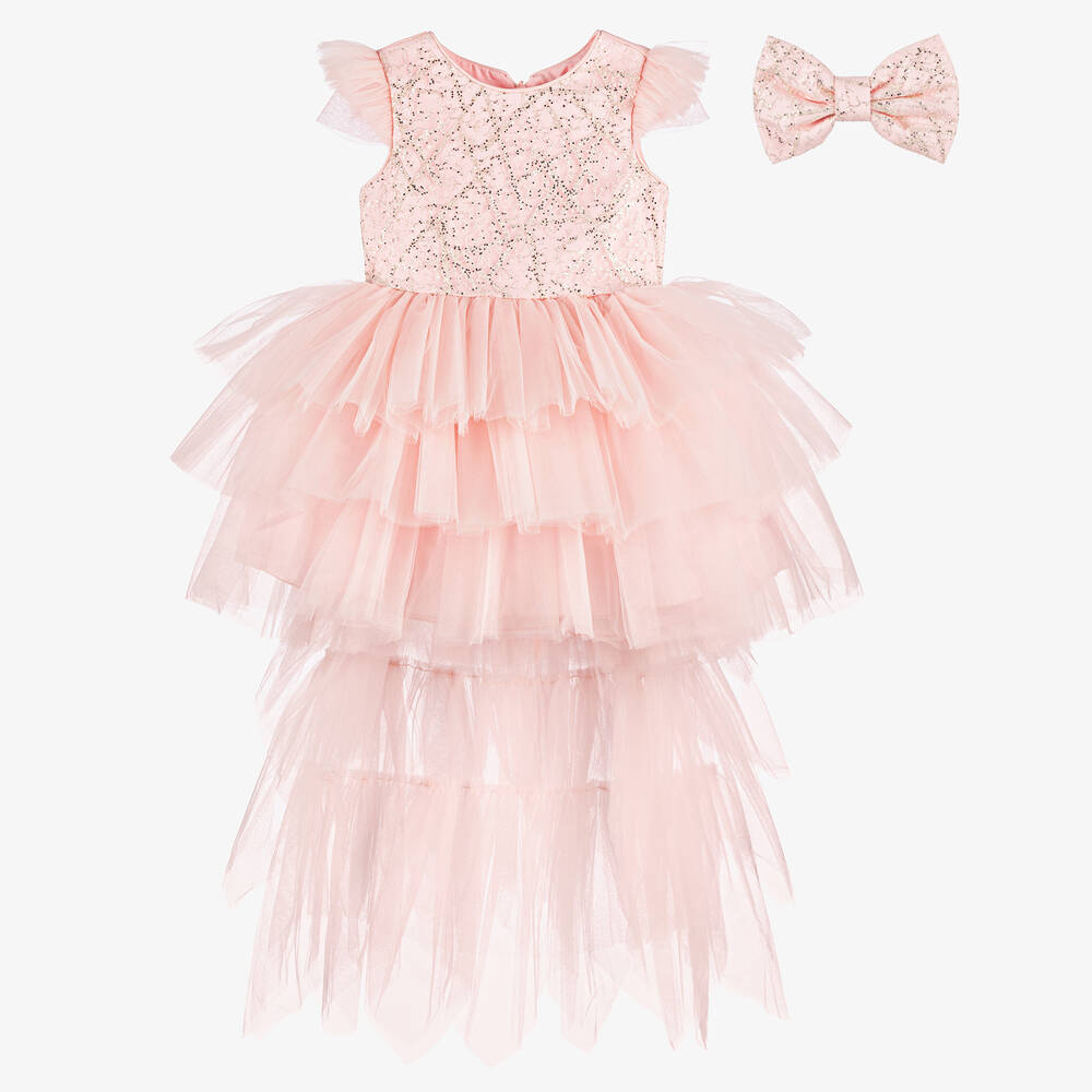 Girls can make an entrance in this pink tulle special occasion dress by Caramelo Kids, with it's glittery silver bodice on the front and detachable train on the back. Tiered, with lots of volume, it has a large, detachable bow on the back and comes with a matching bow hair clip to complete the look.