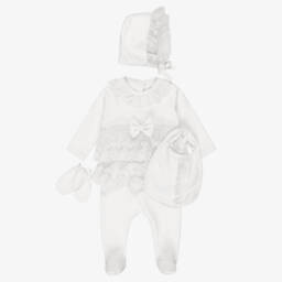 - Set contains: two-piece babygrow, bonnet, mittens, bib