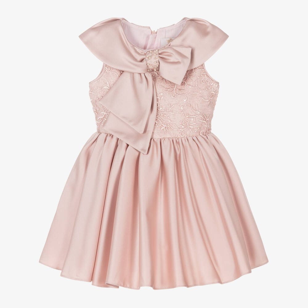 Elegant pink special occasion dress for girls by Caramelo Kids, with a beautiful collar incorporating a large bow with pearl and crystal detailing. The beautifully embroidered bodice shimmers with sequins, whilst tulle petticoats ensure extra volume on the gathered skirt.