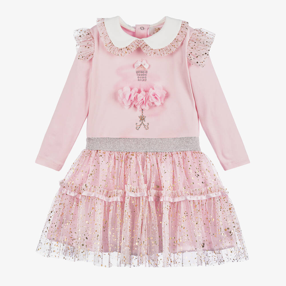 Lovely pink skirt set for girls by Caramelo Kids, sparkling with metallic gold and silver polka dots. The ruffle-trimmed top has a sweet dress motif printed on the front, with encrusted diamantés, satin bows and gathered tulle. It fastens with poppers on the back, helping with easy dressing. The fabulous tutu skirt has a glittery, elasticated waistband for comfort and is lined in soft satin for volume and shape.
