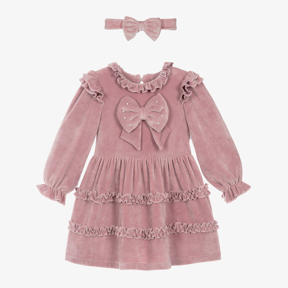 Pale pink dress for girls by British brand Caramelo Kids, with ruffled trims and a large bow on the bodice, embellished with white pearl beads. Made in super soft velour, with a full, gathered skirt, it is both pretty and beautifully comfortable. It fastens with a pearl button and loop on the back. A coordinating headband completes the pretty look.