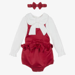 In a lovely shade of red, this delightful babysuit set for girls is by Caramelo Kids. Made in soft cotton jersey, the off-white bodysuit has an oversized bow collar and frilled cuffs. The sweet pinafore style shortie is made in smooth sateen and trimmed with a pretty bow and ruffles. Fully lined for comfort, it has button-fastening shoulder straps and poppers between the legs. This lovely outfit comes with a matching bow headband to complete the look.