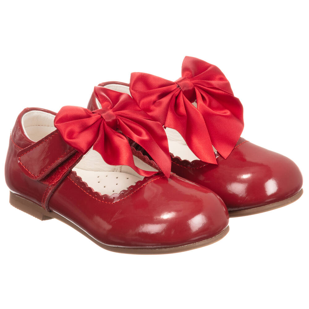 Girls smart, red Mary Jane style shoes by Caramelo Kids, made in patent leather. Lovely for a special occasion, they have pretty scalloped edges and silky satin bows on the front. For added comfort, there is a soft cushioned insole and they fasten easily with velcro straps.