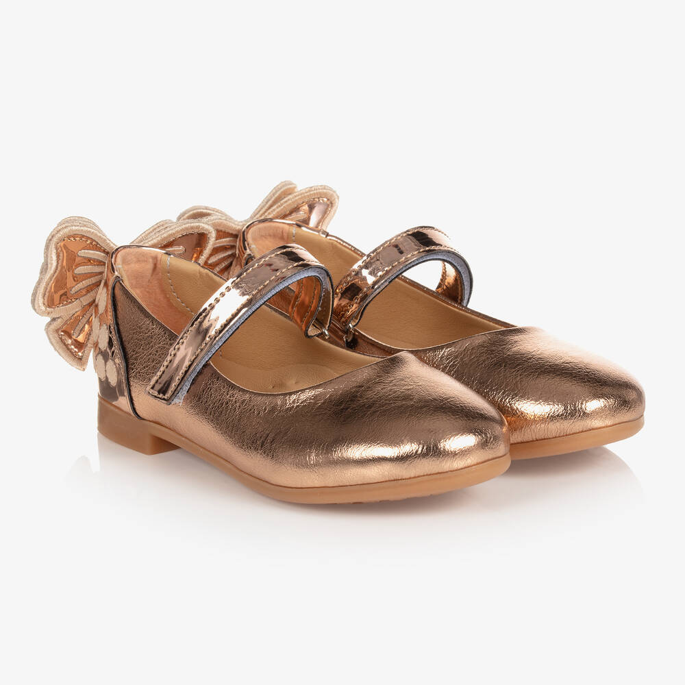 Girls rose gold ballerina shoes by Caramelo Kids. Made in soft leather, with a leather lining and padded inner sole, they have beautiful butterfly wings attached at the heels. They have an ivory patent velcro fastening foot strap, a small heel, and a non-slip rubber outer sole.
