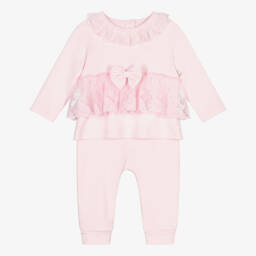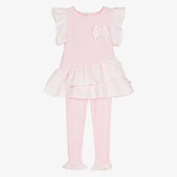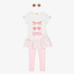 A lovely leggings outfit for girls by Caramelo Kids. Little girls will love dressing in this white tunic top and green leggings set decorated with a pretty mermaid print, green floral appliqués and faux pearl beads. There are little diamantés to add a touch of sparkle and a tulle hem. A pair of light green leggings complete this cute outfit.
