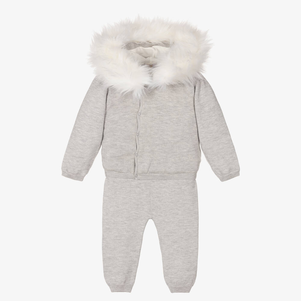 Charming grey trousers set for little boys and girls by Caramelo Kids, knitted in soft and lightweight cotton blend. Lovely for styling on casual days, the top has a removable faux fur trim that buttons onto the hood. It has a tonal logo embroidery and poppers fastening on the front, pairing easily with matching trousers.