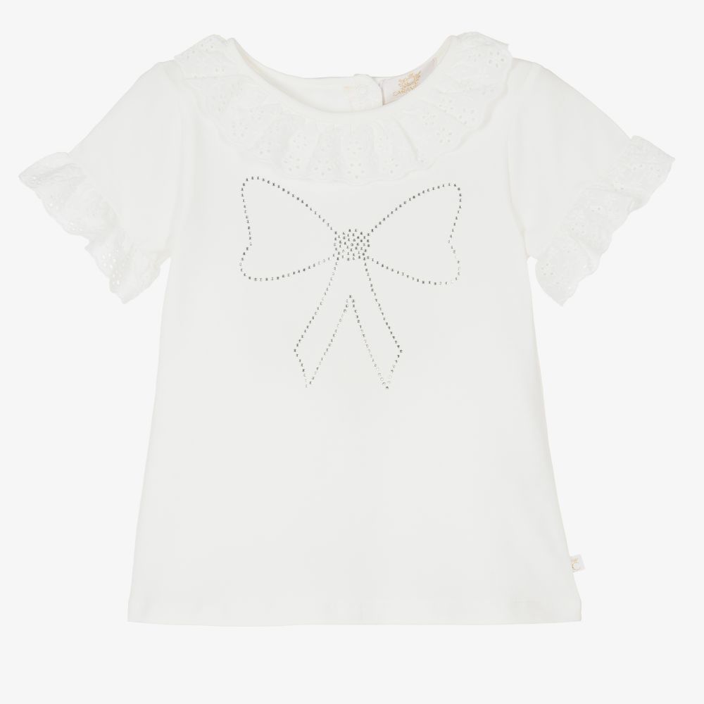 Ivory T-shirt for girls by British brand Caramelo Kids, with a diamanté bow on the front. Made in comfortable cotton jersey, there are pretty cotton cut work frills around the neckline and cuffs. A logo tab is sewn into one side seam.