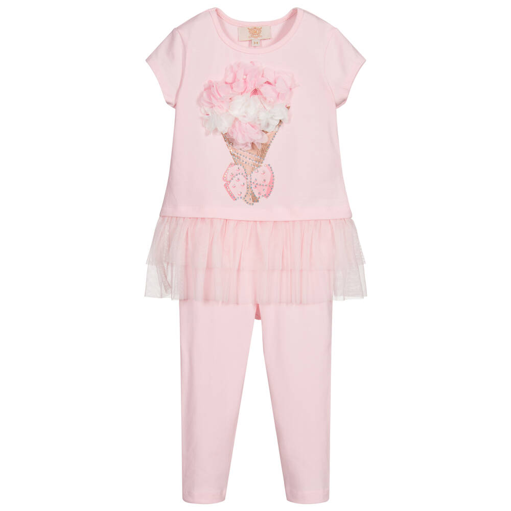 Pink leggings set for girls by Caramelo Kids, made in soft cotton jersey. The tunic top has a beige ice cream cone print on the front, decorated with diamantés and pink and white fabric flowers, with pearls. It has a soft tulle hemline, giving it extra length. The leggings have a comfortable elasticated waistband.