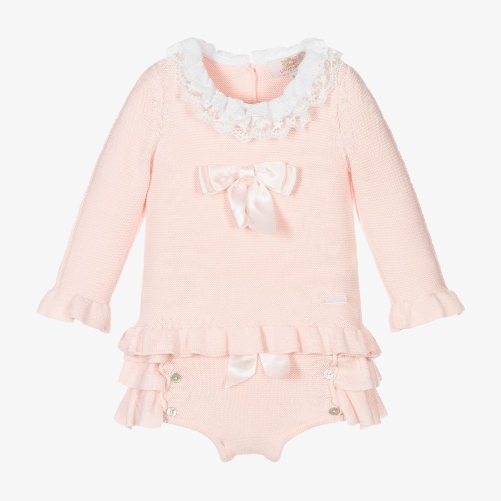 Knitted in soft cotton, this pale pink top and shorts set for little girls is by Caramelo Kids. The sweater has a pretty ruffle collar, in lace and broderie anglaise cotton. The shorts have decorative mother-of-pearl button fastenings on the front, with knitted ruffles on the back. Both pieces are trimmed with ribbon satin bows on the front.