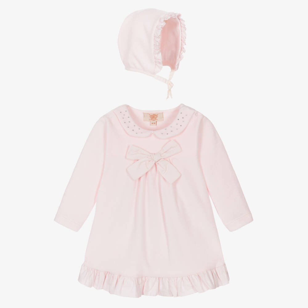 A pretty pale pink two piece dress set by Caramelo Kids, made from soft velour with pink trims, and tiny silver gems on the collar. The dress comes with a matching bonnet, that ties underneath the chin.