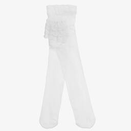 A pair of pale pink tights for baby girls by Carlomagno, made in soft and lightweight microfibre. These pretty tights have lace ruffles on the back, for a cute finish.