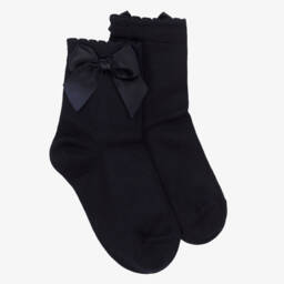 Navy blue socks for girls by Carlomagno, knitted in soft and stretchy cotton blend. They have a pretty scalloped cuff and a satin bow on the side for a feminine finish.