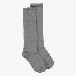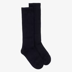 Navy blue knee-length socks for boys and girls by Carlomagno. Knitted in a soft, stretchy cotton blend, they have a ribbed cuff for comfortable wear.