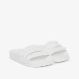 Light pink and white Mini-me sliders for girls by Carmen Sol, styled with iconic Borchia studs. Great for the beach, these easy slip-on shoes have pink glossy straps across the foot and a contoured footbed for added comfort. Girls will love the unmistakable scent of rose.