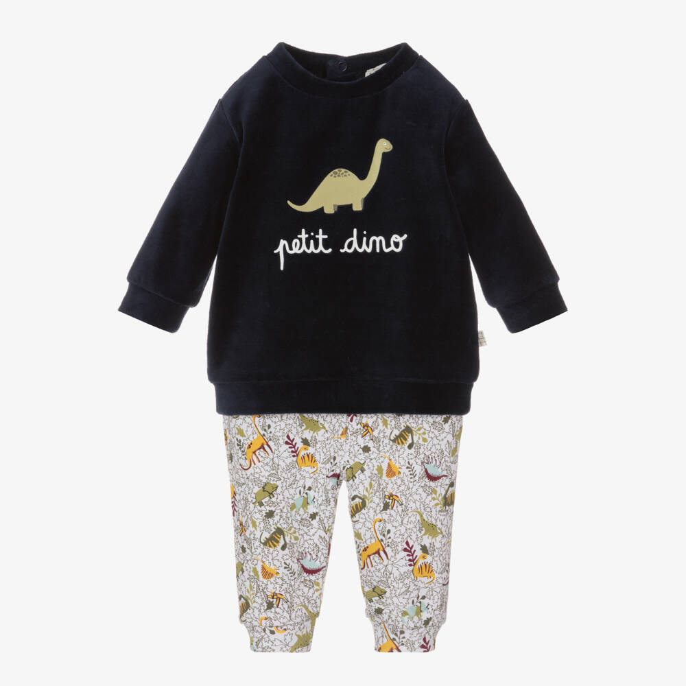 Fun navy blue and white legging set for baby boys by Carrément Beau, made from soft organic cotton jersey. The long-sleeved velour top has a 'petit dino' slogan on the front with a green dinosaur graphic. It has popper fastenings on the back to make changing effortless. In comfortable jersey, the trousers are designed in a coordinating dinosaur and leaf print with a gently, elasticated waistband.