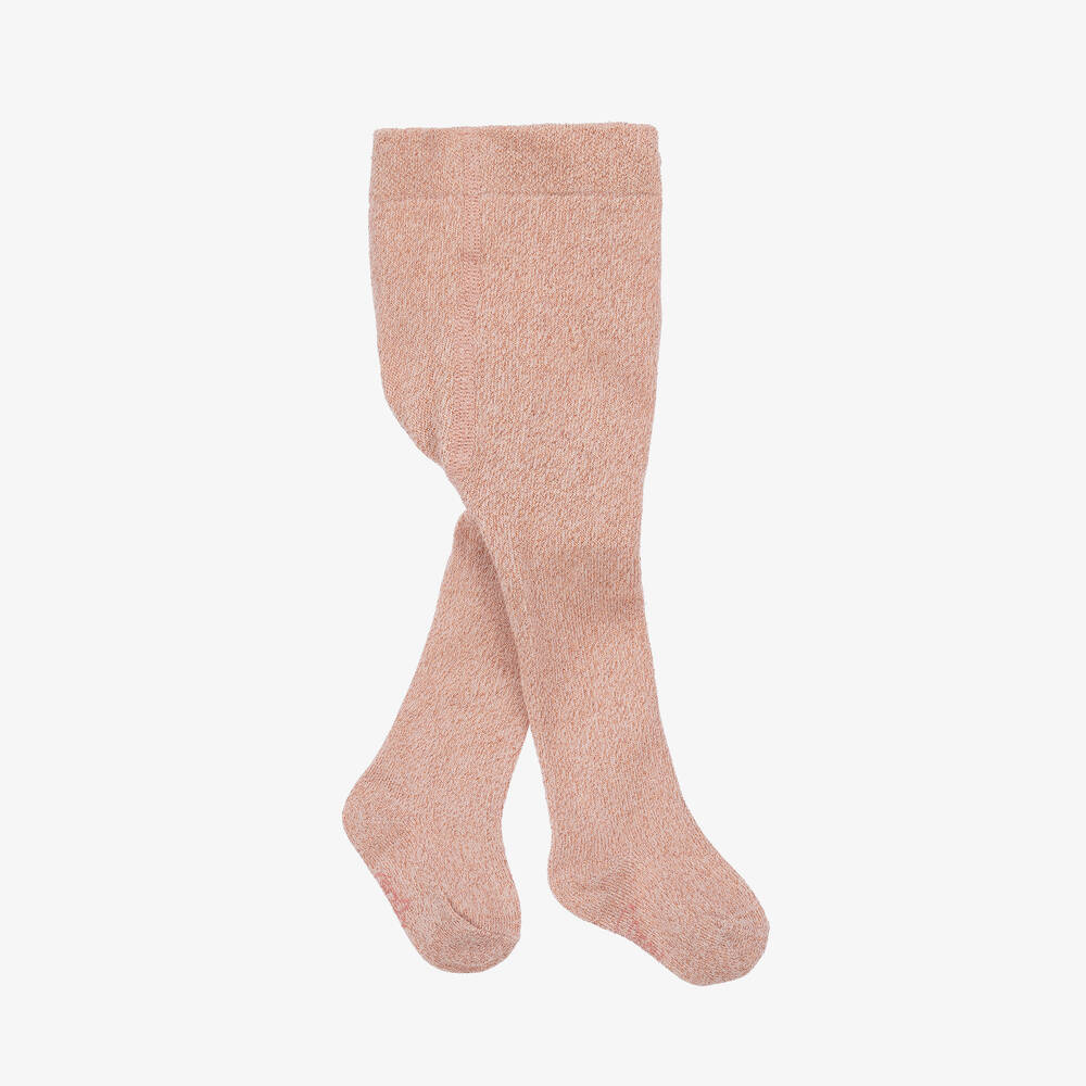 Pink tights for baby girls by luxury French brand Carrément Beau, knitted in a soft and stretchy cotton blend. They are patterned with glittery rose gold metallic thread, making them a beautiful accessory for special occasions.