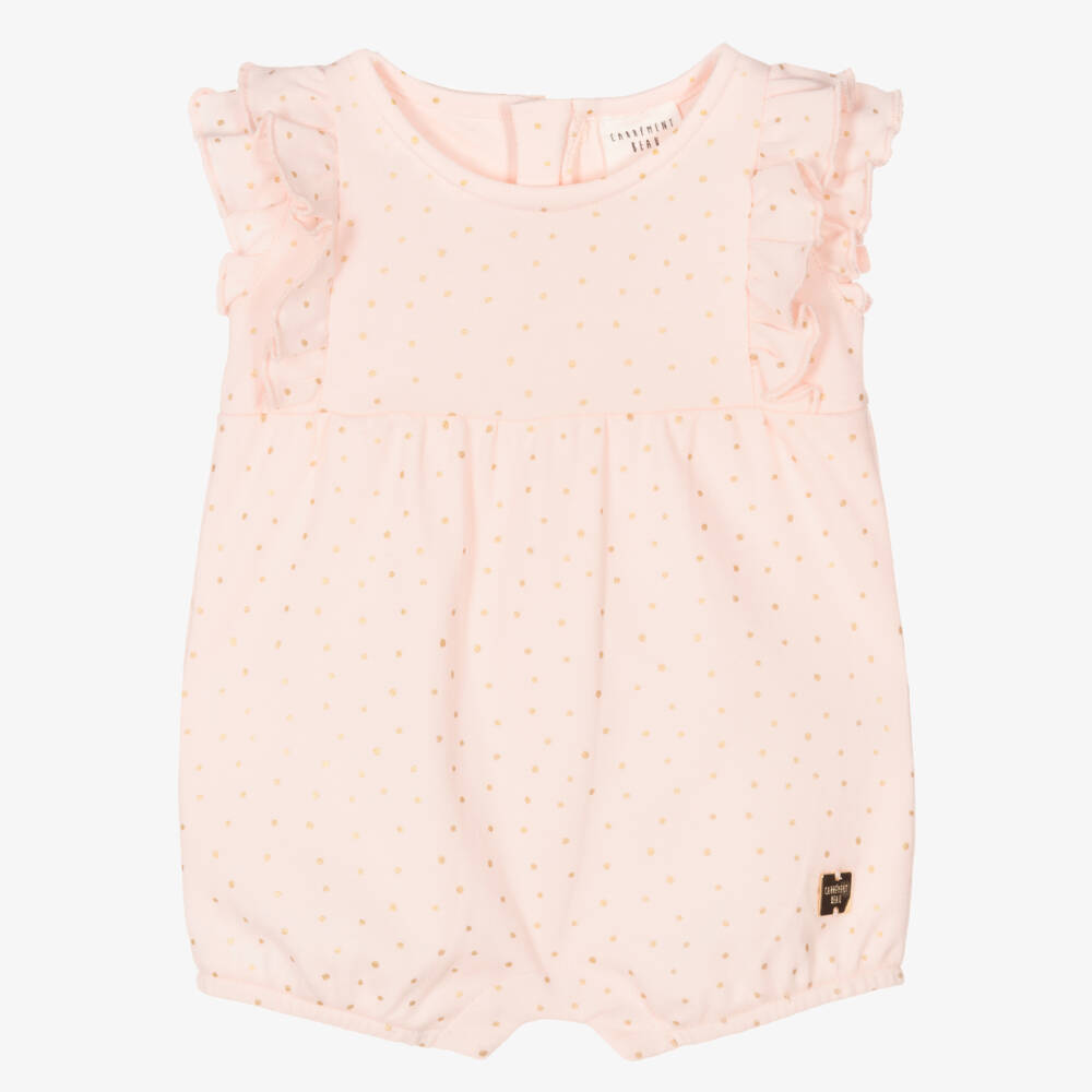 A delightful pale pink shortie for baby girls by French brand Carrément Beau. It has pretty ruffles over the shoulders and is patterned in metallic gold dots. Made in comfortable organic cotton jersey, it fastens with a concealed zip on the back and has easy fastening poppers between the legs. There is a gold metal branded plate on the front for a subtle designer finish.