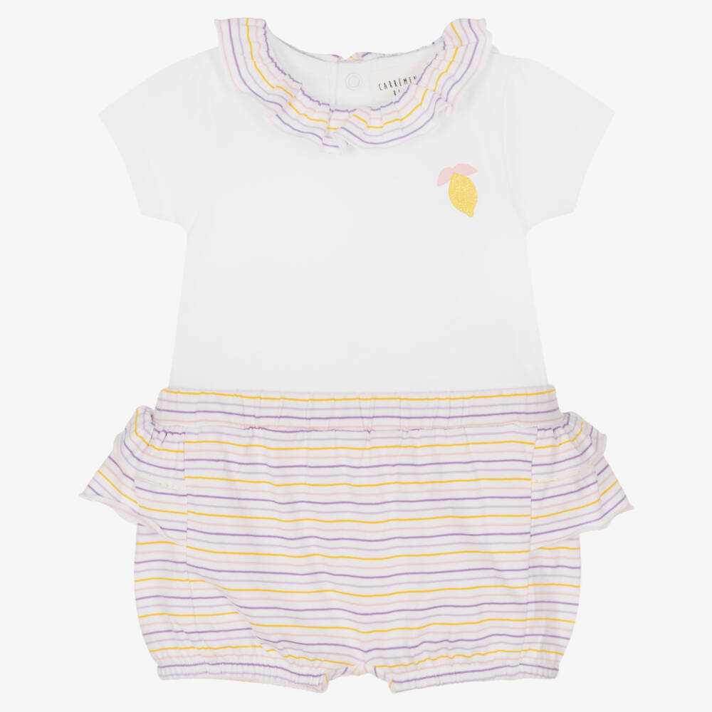 A lovely white top and shorts set for baby girls by French brand Carrément Beau. The shorts are patterned in pink, yellow and purple stripes, with a pretty ruffle trim on the back. The T-shirt has a sweet ruffle collar in matching stripes, with a sparkly lemon motif on the chest. Made in comfortable organic cotton jersey, the top fastens with poppers on the back and the shorts are gently elasticated around the waist and legs.