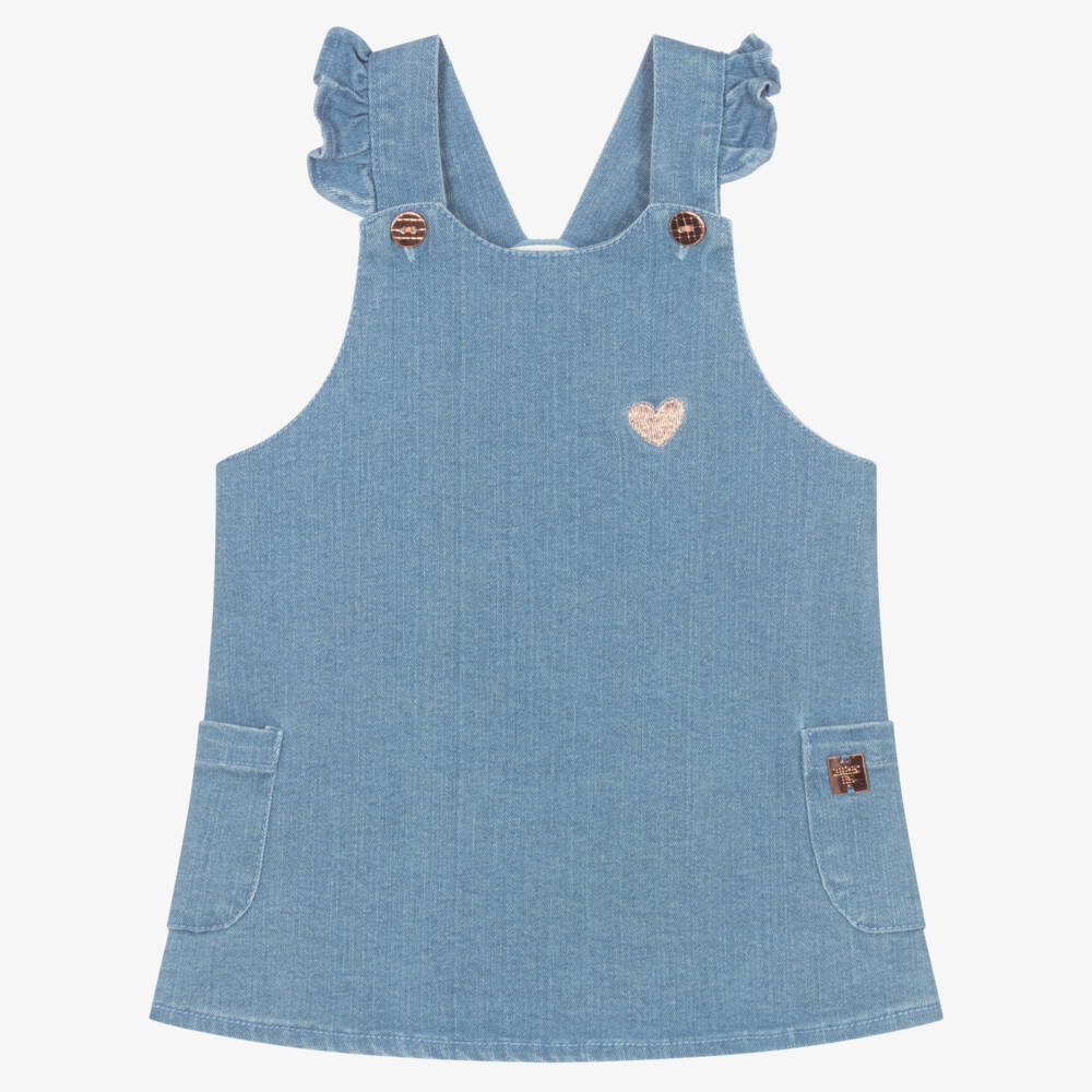 Blue denim pinafore dress for little girls by Carrément Beau. Made in soft, stretchy cotton, this lovely dress has rose gold buttons on the adjustable ruffle shoulder straps, with a shiny logo plate on one side pocket and an embroidered heart on the front. The upper half is lined with soft cotton voile for comfort.