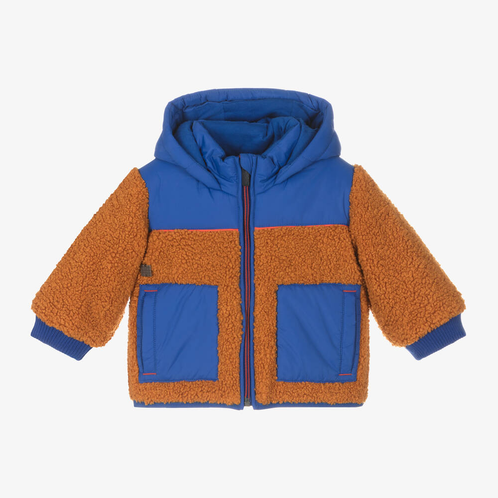 Lovely blue and brown hooded jacket for little boys by French brand Carrément Beau, made in silky smooth and bouclé fabric. Padded for extra warmth, this cosy jacket has ribbed cuffs and patch pockets on the front. Lined in soft cotton jersey, it fastens with a zip, which has a useful chin guard.